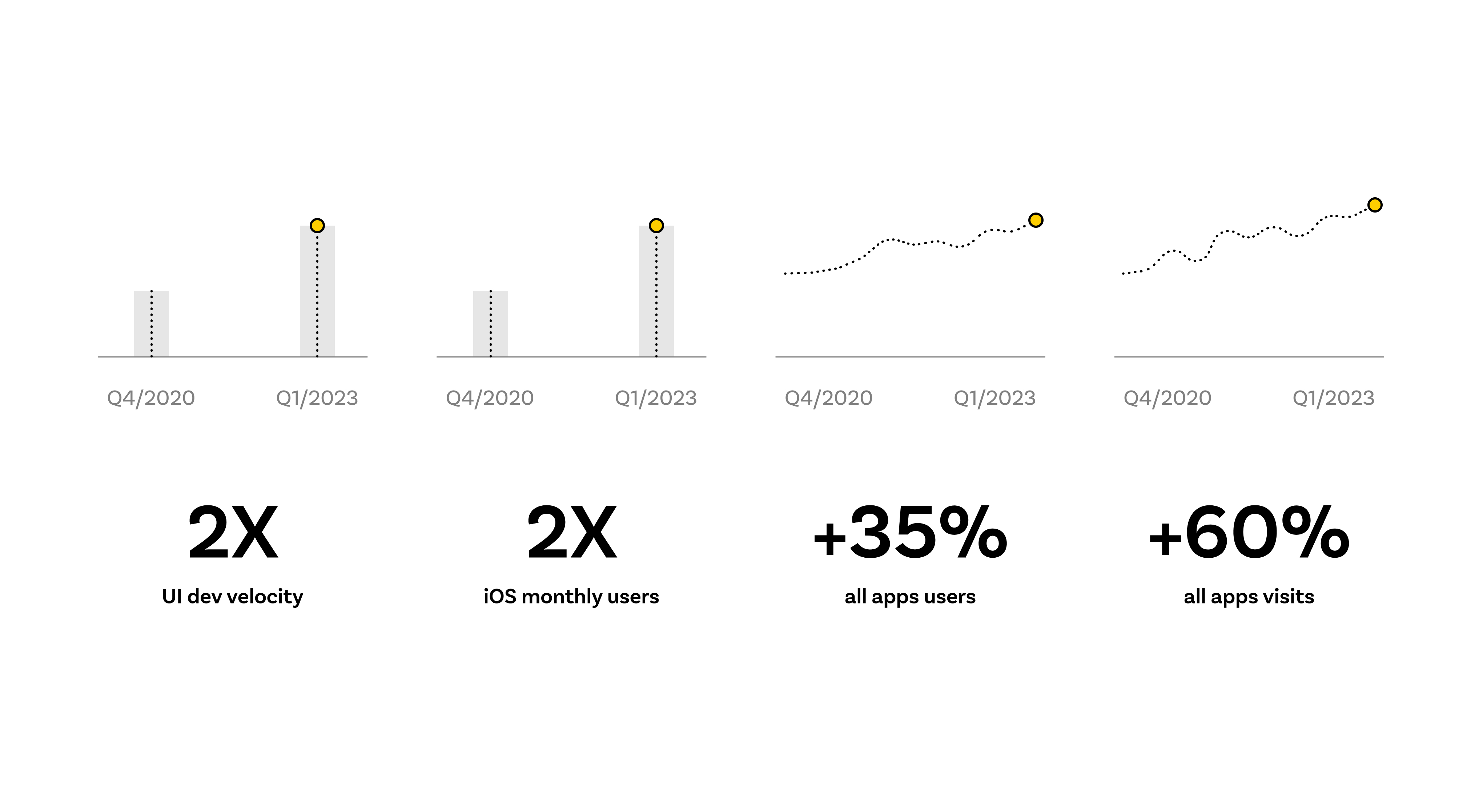 To conclude, user growth also compounded with time. While doubling the velocity of both design and development for new projects, as well as doubling the iOS user base, we increased the overall total number of all users across all mobile apps by 35%and boosted app visits by 60%.